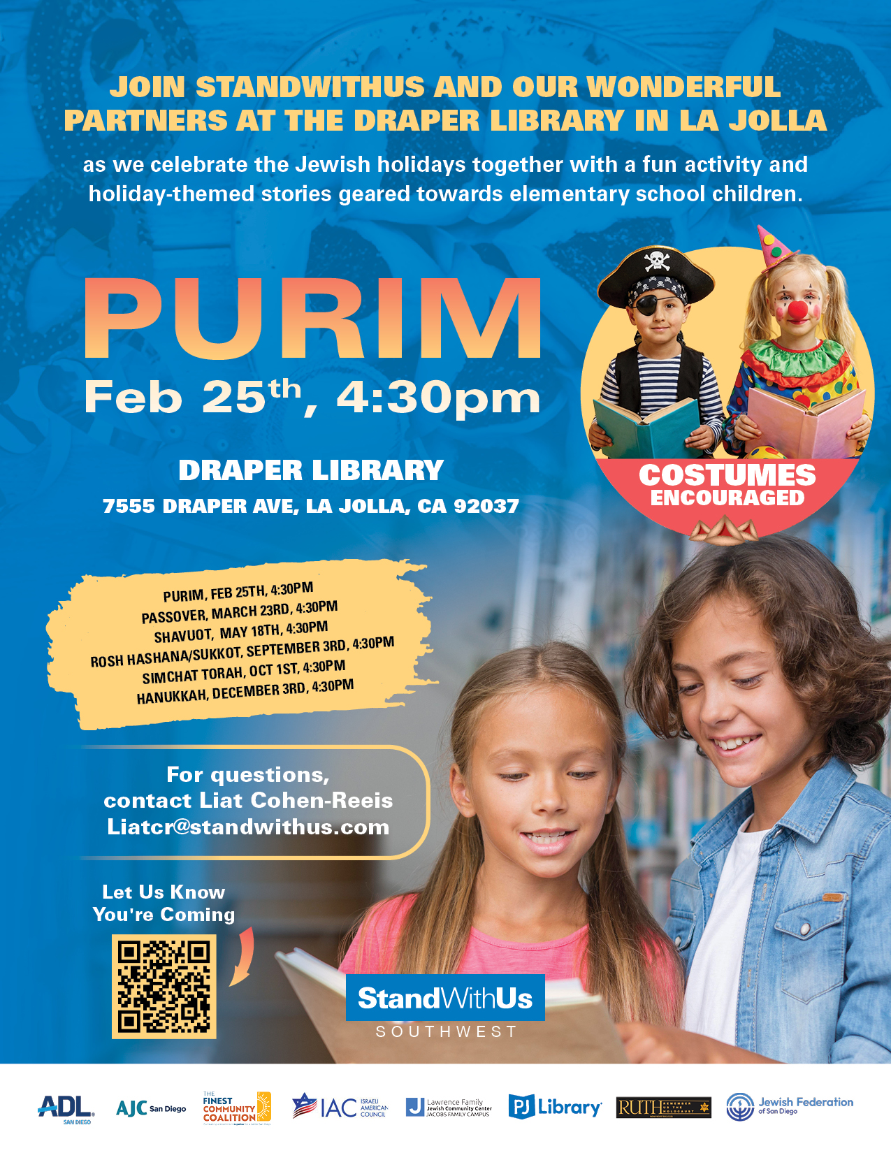 Join ADL San Diego, StandWithUs, and the Lawrence Family JCC at the Draper Library in La Jolla for a joyful Purim celebration! Families with children in grades K–5 are invited to this free event featuring engaging stories, music, and age-appropriate activities that teach about Jewish holidays while building community connections.