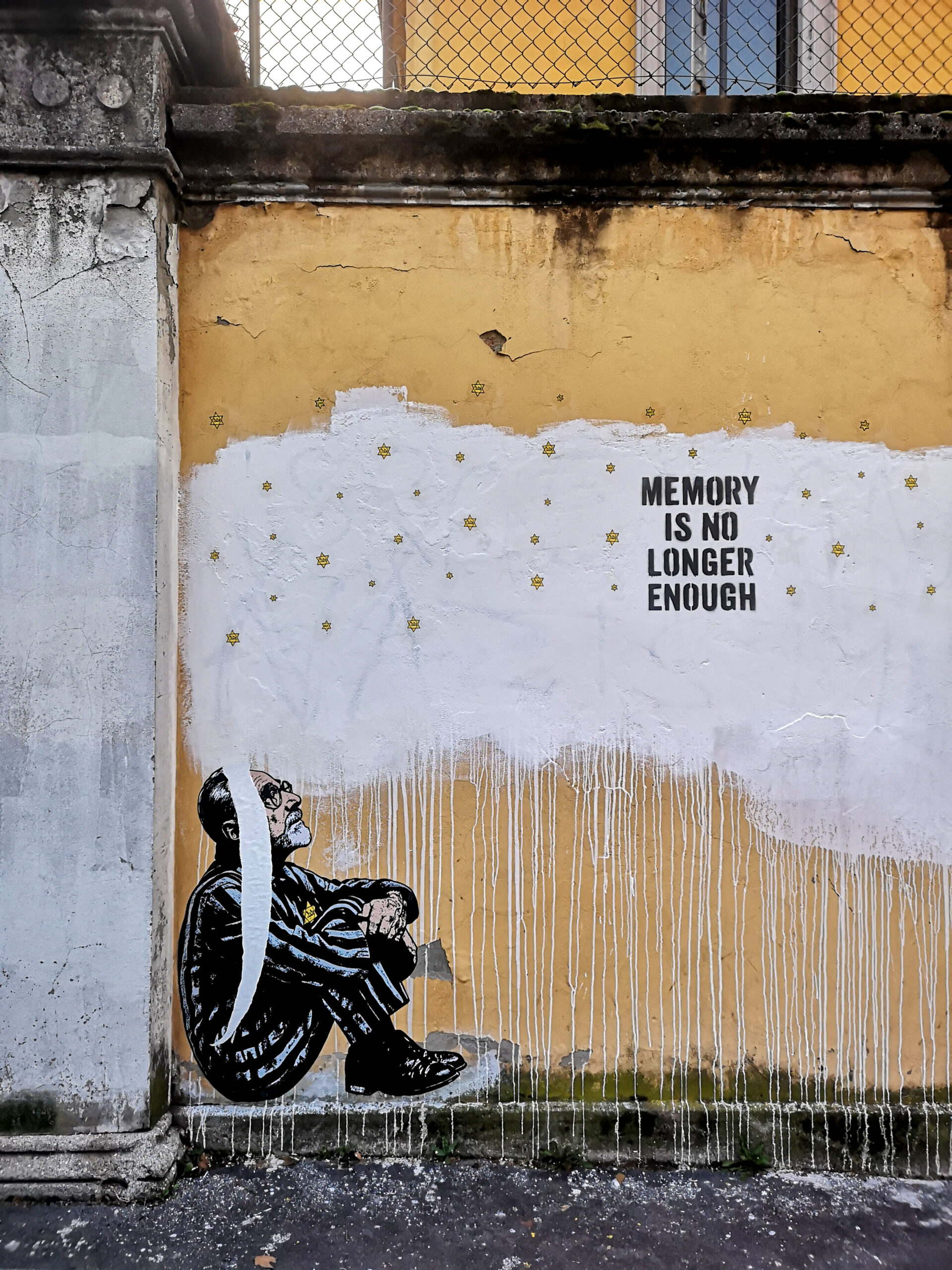 Just a few days after it appeared, the mural dedicated to Primo Levi, created by contemporary artist aleXsandro Palombo for Holocaust Remembrance Day, was vandalized. The artwork, entitled “Memory Is No Longer Enough,” is visible on the wall of the Montello Barracks in Milan and depicts Levi and Anne Frank sitting on the ground in the uniforms of Auschwitz deportees, their gaze turned toward a sky of yellow stars, the same stars Jews were forced to sew onto their clothing. This firmament, transformed by the artist into a sky of memory, evokes the six million victims of the Nazi genocide.